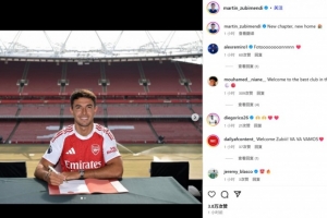 祖比门迪晒出自己身穿阿森纳球衣在酋长球场的签约照,并配文:“新的篇章,新的家。”